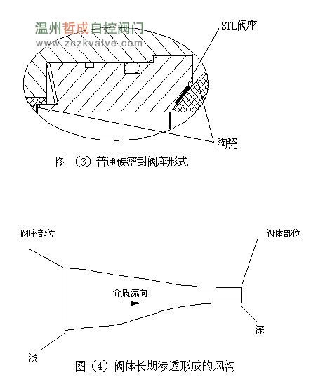 图(3)阀门在启闭过程中,硬密封面能将球体密封面上的干灰和固体颗粒拔离球体密封面;因此硬密封阀座具有清洁球体密封面的功能,由于密封面在加工过成中,产生尺寸公差和形位公差形成密封面的微观不平度,硬密封面对微观不平度不能进行有效地补偿。阀门球体密封面和阀座密封面又受到介质的作用力推动干灰从密封面的一侧,向密封面的另一侧渗透;由于长期的渗透阀座密封面和阀体遭受磨损,在阀座密封面和阀体,特别是在阀体,形成沿密封面宽度(球体通经)由浅变深由宽变窄的风沟,有的能将阀体搞穿造成阀体外漏。