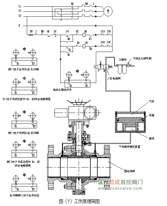 关闭阀门:按下按扭QC再按下按扭SC接触器KC有信号触头KC闭合电动机M转动阀门开始关闭,阀门微动开关K1、K2闭合二位电磁阀有信号;二位电磁阀处于P位排气,气控液体增压装置上腔气体压力趋于0;下腔由于弹簧的作用液体趋于负压;球阀U形软阀座缩回到矩形槽中。U形软密封阀座密封面脱离与球体密封面的接触,实现阀门启闭过程中U形软密封阀座密封面与球体密封面的零接触。球开始转动关闭阀门直至转到0度电机停止转动阀门关闭;微动开关K2断开,二位电磁阀无信号;在二位电磁阀弹簧的作用下,二位电磁阀N导通,压力气体进入气控液体增压装置的上腔。由于压力的作用活塞向下移动压缩液体,导致下腔液体的压力增加球阀中的软阀座;在液体压力的作用下,与球体密封面作用形成密封比压而密封。