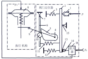 1-输入波纹管2-主杠杆3-迁移弹簧4-反馈凸轮转动支点 5-反馈凸轮6-副杠杆7-副杠杆支点8-薄膜执行机构膜头气室9-反馈杆 10-滚轮11-反馈弹簧12-调零弹簧13-挡板14-喷嘴15-主杠杆支点 16-气动单向放大器 图2 模拟阀门定位器结构图 (2)随着现代技术的发展又增加了两种方法在应用过程中可改变软件,不变动硬件,仅用软件可变,进行调整的方法,智能阀门定位器是当今的新技术产品。用智能定位器的反馈信号予以曲线改变,仅软件改变即可,亦可在应用过程中改变软件,不改变硬件。