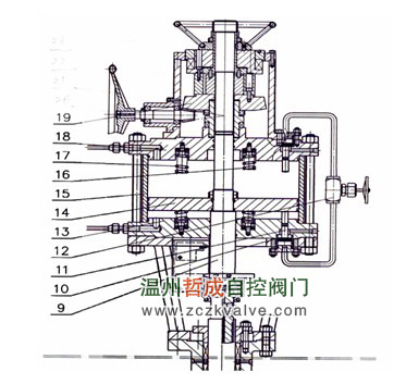 9-上阀杆 10-缓闭油缸 11-缓闭油缸活塞 12-节流阀 13-下气缸座 14-活塞 15-气缸 16-短弹簧 17-长弹簧 18-上气缸座 19-手动机构