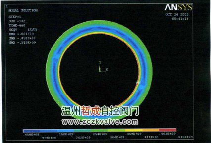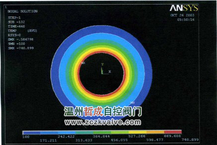 2.6 用有限元对主件进行应力场温度场的分析计算 用有限元对主要零件(阀体、阀座、阀芯、阀杆)进行应力场和温度场的分析计算,计算书长达58 页。计算前要确定边界条件,计算后要修改设计,然后再计算。该项计算聘请清华大学刘凤梧博士后,天津大学王静博士和天津军事交通学院力学教研室主任王兴科教授共同完成。以计算书内阀体的有限元分析为例(见后面附图),图20为阀体内无隔热层加热11分钟时的温度分布图;图21为阀体无隔热层加热11分钟时的等效应力分布图;图22为阀体内有隔热层加热11分钟时的温度分布图;图23为阀体内有隔热层加热11分钟的等效应力分布图。从分布图可知道,阀体内衬隔热保温材料是非常必要的。