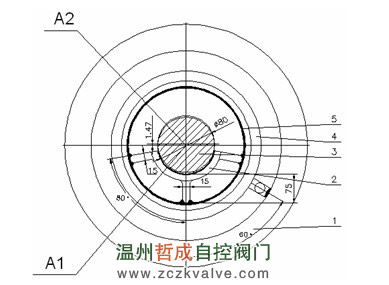 2.5 阀芯的支承结构 本阀门由于进出口管道布局问题,用户要求阀门卧式安装。阀芯组合体重达300公斤,靠上、下阀座中间的支承架承担。阀芯的密封面高低位置由阀芯导向轴中心的高低位置来决定(见图5)当阀门由常温升到高温时,例如升高800℃,阀芯导向轴的直径会增大:16×10-6×80×800=1.02,托架下部会升高:16×10-6×75×800=0.96,阀芯导向轴的中心会升高:1.02÷2+0.96=1.47(mm),就是说常温时阀芯的密封面中心在A1点,高温时阀芯的密封面中心在A2点,中心上移了1.47mm。阀门设计时如果忽略了这一计算,则阀门在高温时就很难密封。