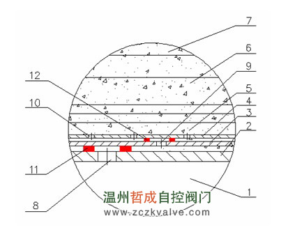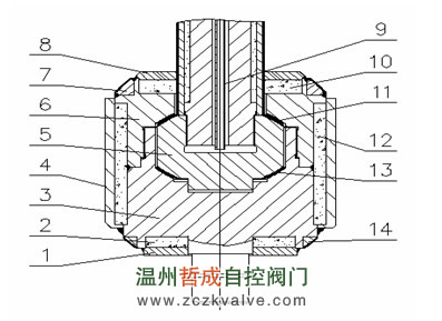 1-下护板 2-下隔热层 3-阀芯下部 4-外圆防护套 5-阀杆头部 6-阀芯上部 7-上阀芯密封球面 8-上护板 9-冷却气管 10-上隔热层 11-上阀芯内球面 12-圆周隔热层 13-下阀芯内球面 14-下阀芯密封球面