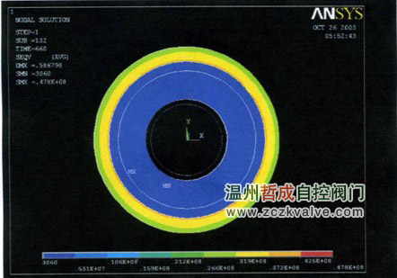 阀体内有隔热层加热11分钟时的等效应力分布图