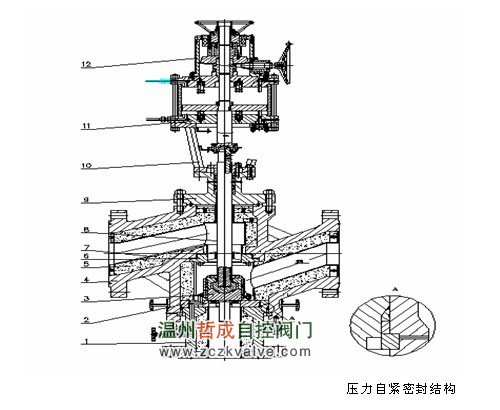 图1 高压超高温三通换向阀总装 1-阀底座 2-下阀座 3-阀芯总成 4-阀体 5-隔热衬里 6-上阀座 7-隔热套管 8-阀杆总成 9-阀盖 10-支架 11-气动传动总成 12-手动传动总成