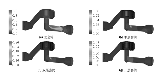 图6(c)为不同模型气体体积分数曲线图,可见无套筒模型空化范围从8号持续到18号监测点,在14号监测点出现最大气体体积分数0.975;单层套筒与双层套筒模型空化范围大幅缩小,均从9号持续到13号监测点,与11号监测点出现最大气体体积分数相同,分别为0.823与0.750;三层套筒模型空化范围从9号持续到12号监测点,在11号监测点出现最大气体体积分数0.183。说明增加套筒级数能有效抑制壁面上的空化现象,并使空化相对严重的位置转移至套筒处,避免对接近出口段阀体产生汽蚀损坏。