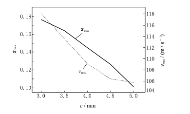 由图7可见:随着级间间隙c从3mm增大至5mm,局部最大流速υmax从117m/s持续降低至105m/s,最大气体体积分数αmax从0.183则降低至0.106;级间间隙由3mm增加到4.5mm的过程中,最大气体体积分数与最大流速均近似呈现线性下降趋势。说明在结构尺寸允许的条件下,适当增加级间间隙,使级间压降与流速缓冲区域增加,有利于降低阀内流速与空化抑制。