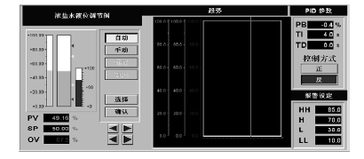 在图1中,PV为阀位反馈,SP为设定值,OV为阀位输出值,为逐度的开关阀门。控制方式为:选择输出信号的正反作用,在PID参数中设置PB、TI和TD,在报警设定中可设置高高、高、低和低低报警值,趋势中的红色线是阀位输出值,蓝色线是阀位反馈值,绿色线是设定值。 自动模式与手动模式之间的相互转换应平稳。当自动转换发生时(受限或异常测量值),应具有适当的途径提示操作员。